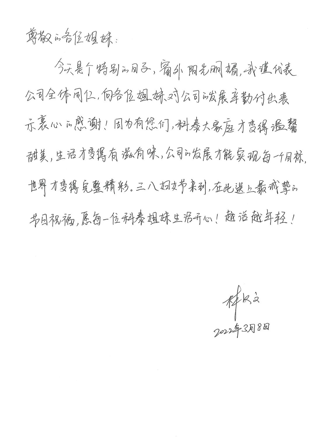 公司總經理林漢文代表全體同仁,向科泰女神們對公司的發展辛勤付出表示衷心的感謝,并且送上最誠摯的節日祝福!手寫祝福,紙短情長,承載著科泰大家庭的溫暖與情誼。